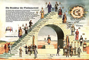 1780 trat der bis dahin der Freimaurer-Vereinigung „Strikte Observanz“ angehörige Freiherr von Knigge dem Illuminatenorden bei und sorgte für einen neuen Kurs, der mit der Erringung der Vorherrschaft über das Logenwesen auf dem Wilhelmsbader Konvent 1782 seinen Höhepunkt fand. Weishaupt führte auch ein 13-stufiges System in die Freimaurerei ein, daß sich in drei Klassen unterteilte - analog den alten Freimaurer-Stufen - aber zusätzlich Unterstufen enthielt: I. (Kinderstube) 1. Vorbereitungsaufsatz 2. Noviziat 3. Minervalis 4. Illuminatus Minor II. (Maurerei) 1.a. Lehrling 1.b. Geselle 1.c. Meister 2. a. Illuminatus Major 2.b. Illuminatus Dirigens III. Mysterien 1.a. Geringerer Prister 1.b. Geringerer Prinz 2.a. Höherer Magus 2. b, Rex