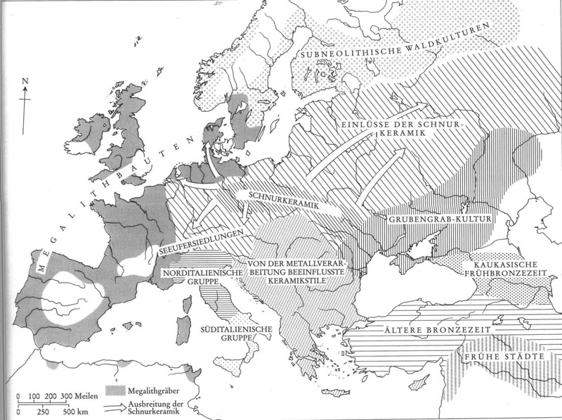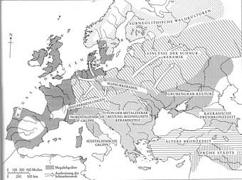 Dadurch stellt sich wiederum die Frage nach der fehlenden Ausbreitung des Indogermanischen in die westeuropäischen Megalithgebiete, die ja zweifellos vom Neolithikum bis zur Bronzezeit enge Handelsbeziehungen unterhielten. Dies scheint bislang kaum vereinbar, es sei denn, man zieht eine Trennung zwischen westmegalithischem (Westeuropa, Mittelmeergebiet?) und Nordostmegalithischem ?Reich? (Deutschland, Osteuropa), die sich auch sprachlich auswirkte.