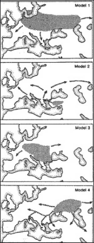 Nachdem noch in den 80er Jahren in der Diskussion um die Urheimat eine Annäherung auf den Raum zwischen Nord/ Mittel- und schwarzem bzw. kaspischem Meer (Modell 3) erzielt worden zu sein schien, stellte Colin Renfrew der Kurgan-These (zuletzt 1996) seine Annahme der Entstehung des Indogermanischen im anatolischen Raum entgegen:11