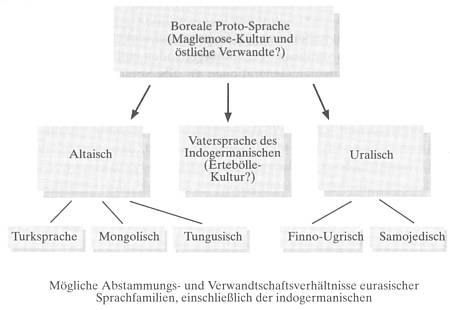 Eine dritte, bislang kaum beachtete Hypothese, ist die direkte Ableitung des indogermanischen aus einer durch die Ertebolle-Ellerbeck Kultur (erste nordische Kulturstufe?) erfolgte Überschichtung der Bandkeramischen Kultur, die aus einer ?borealen Proto-Sprache? das Indogermanische als Sprache einer sich bildenden ?Herrenschicht? entstehen läßt. Diese kontrolliert als Trichterbecherkultur den Raum zwischen Nord- und Südosteuropa.14 Danach müßte sich zwischen 6. und Ende des 5. Jahrtausends eine indogermanische ?Ursprache? entwickelt haben, die mit den Wanderungen der späteren indogermanischen Völker verbreitet wurde. Dafür spricht vor allem die Existenz einer potentiellen Trägerkultur, die zu Beginn als Trichterbecher, später als Schnurkeramiker in Erscheinung tritt sowie die schnelle Verbreitung des Indogermanischen.