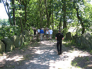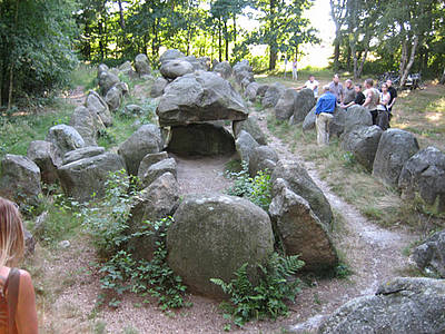 Etwas weiter westlich liegt der Grabhügelkomplex von Visbek. Das Hünengrab ?Visbeker Braut?, ein schmales Viereck von 80 m Länge und 7 m Breite, wird von 71 Steinblöcken eingefaßt. Noch imposanter ist jedoch der ?Visbeker Bräutigam?, der in seiner Ausdehnung 104 m bei einer Breite von 7 m mißt. Den ?Wächter?- Steinen im Südosten stehen an der gegenüberliegenden Schmalseite vier 3 m hohe Abschlußsteine gegenüber. Innerhalb des südwestlichen Teils der Steinfassung liegt eine abgetrennte Grabkammer mit einer Größe von 5,5 x 1,5 m. Während einige Decksteine nicht mehr erhalten sind, sind noch elf Tragsteine feststellbar. Die abgetrennte Grabkammer nährt die Ansicht des Forscherungsansatzes, der in den langgestreckten Steinsetzungen Kirchähnliche Errichtungen zu erkennen glaubt, von denen nur noch die steinernen Grundzüge enthalten sind. Genau wie in heutigen Kirchen, sollen früher innerhalb dieser heiligen Häuser Gräber eingelassen worden sein.